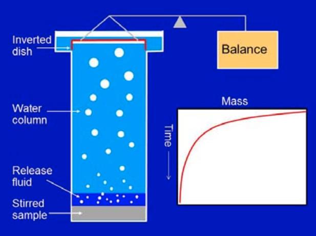 通過水柱上升的氣泡被收集到一個倒置的皿(浮皿)中,這個皿是浸在水中并且連接到一個靈敏的天平。當氣泡聚集在皿上時,由于水被空氣替代,皿的表觀質(zhì)量會降低。皿的表觀質(zhì)量會隨時間記錄下來。
